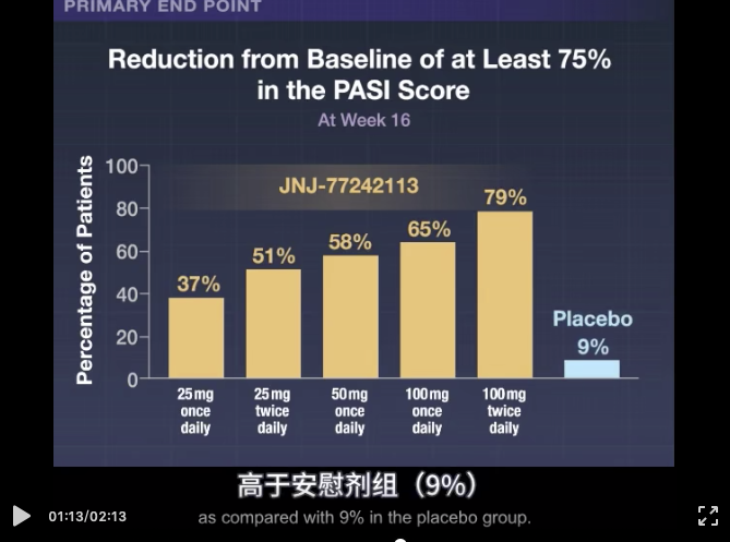 本次研究共有255例患者入组,其中78%曾接受过系统治疗;银屑病患者平均持续时间18.2年。最大JNJ-77242113用药剂量组(每日两次100 mg)实现了79%的PASI 75反应率,最小NJ-77242113用药剂量组(每日一次25 mg)实现37%的PASI 75反应率,均较安慰剂组9%的反应率提高显著。