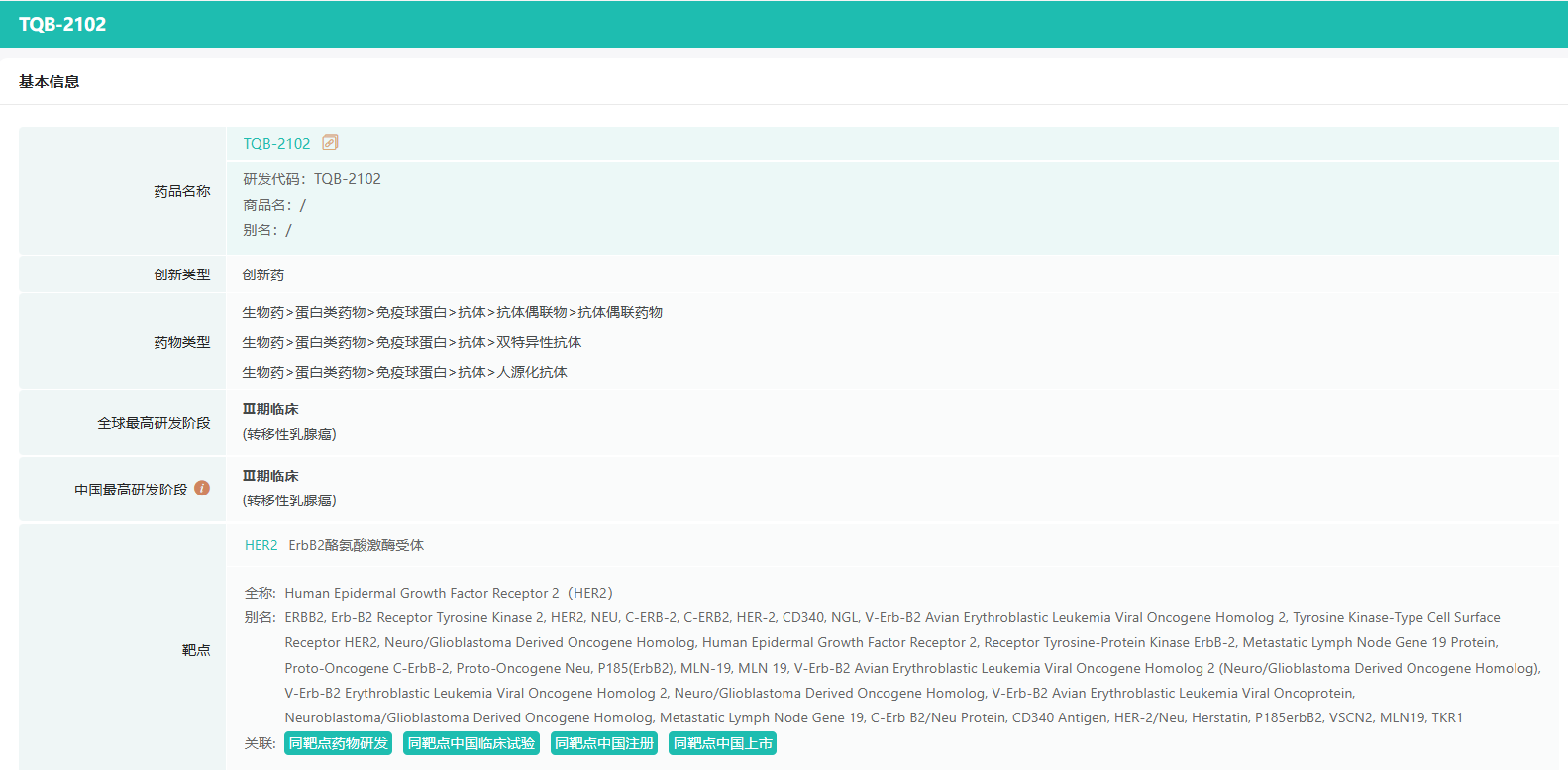 TQB2102是正大天晴自主研发的一种靶向HER2两个非重叠表位ECD2及ECD4的ADC,由人源化HER2 IgG1双抗通过连接子与拓扑异构酶I抑制剂偶联而成。