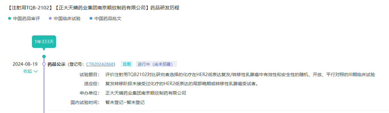 8月19日,据药融云数据库(药融云中国药品审评数据库)显示,正大天晴开发的HER2双抗ADC启动了首个III期临床试验,成为第2款进入III期阶段的HER2双抗ADC。