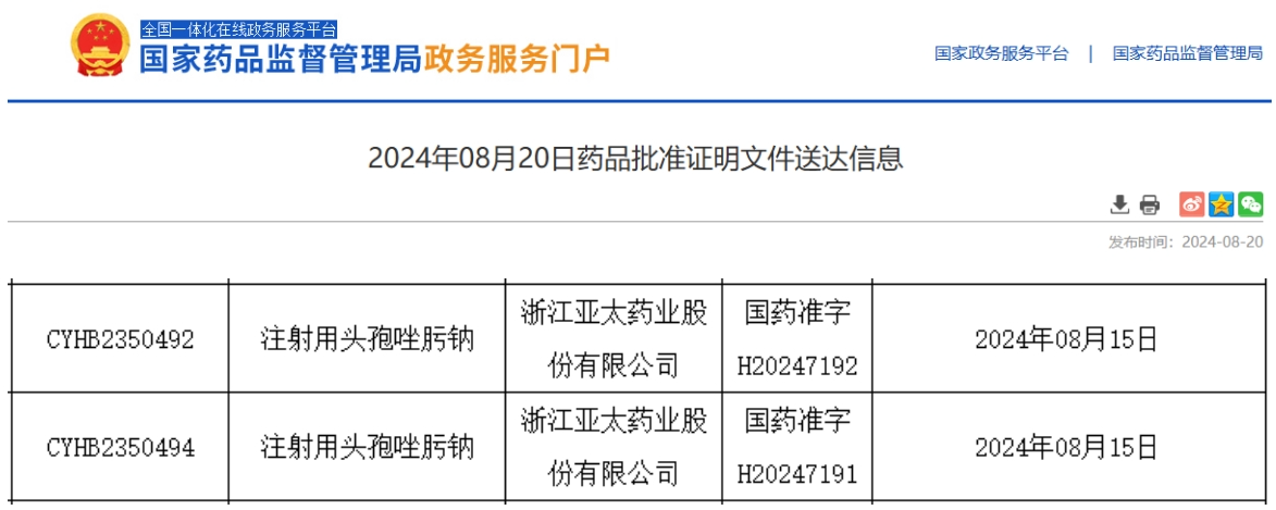 8月20日,据NMPA公示,浙江亚太药业的注射用头孢唑肟钠通过仿制药一致性评价。据药融云数据库显示,注射用头孢唑肟钠在2023年全国院内市场的销售额超35亿元。