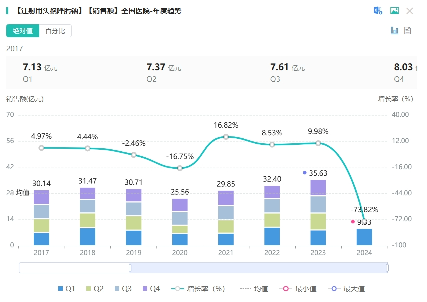 注射用头孢唑肟钠为全国医保乙类药品种,常用于敏感菌所致的下呼吸道感染、尿路感染、腹腔感染、盆腔感染、败血症、皮肤软组织感染、骨和关节感染、肺炎链球菌或流感嗜血杆菌所致脑膜炎和单纯性淋病。据药融云数据库显示,注射用头孢唑肟钠在2023年全国院内市场的销售额超35亿元,同比增长达9.98%。