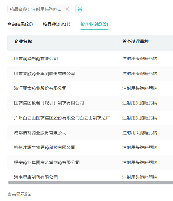 目前国内有41家药企拥有注射用头孢唑肟钠的生产批文,其中有浙江亚太药业、山东罗欣药业、成都倍特药业等9家药企过评。