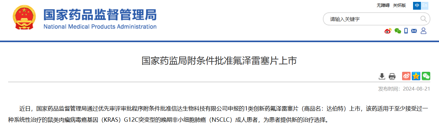 8月21日,据NMPA官网公示,信达生物/劲方医药合作开发的KRAS G12C抑制剂氟泽雷塞片获批上市,用于治疗至少接受过一种系统性治疗的KRAS G12C突变型晚期非小细胞肺癌(NSCLC)成人患者。这不仅是首个在国内获批的 KRAS 抑制剂,也是全球范围内首个获批上市的国产 KRAS 抑制剂。