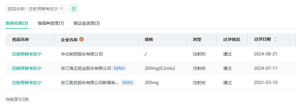 目前,注射用替考拉宁有3家药企过评,其中浙江医药在2021年首家过评,浙江海正药业为第2家过评,本次华北制药为第3家过评。