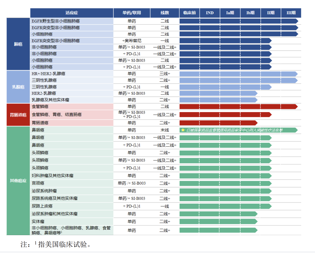 BL-B01D1是全球首创也是唯一进入临床阶段的靶向EGFR×HER3的双抗ADC。根据BMS2024年二季度业绩期官方材料披露,百利天恒与BMS在美国合作开展的BL-B01D1单药剂量桥接临床研究正在拓展适应症从非小细胞肺癌到小细胞肺癌、乳腺癌、食管癌、鼻咽癌等。截至本报告披露日,BL-B01D1正在中国和美国进行超过20项用于治疗肺癌、乳腺癌、头颈鳞癌、鼻咽癌、胃癌、结直肠癌、肝癌、胆道癌、尿路上皮癌及妇科癌症等多种肿瘤类型的临床试验。