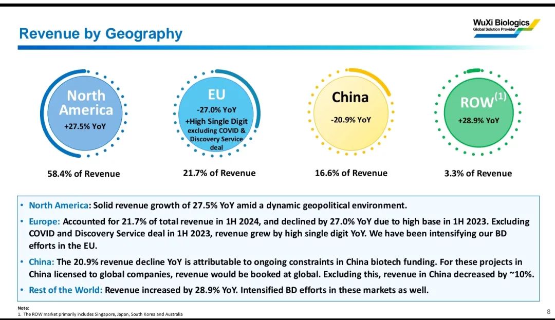 近日,CXO领军企业药明生物半年报出炉,2024年上半年,公司整体营业收入85.7亿元,同比增长1%。非新冠项目收益同比增长7.7%,临床后期和商业化生产收益同比增长11.7%。