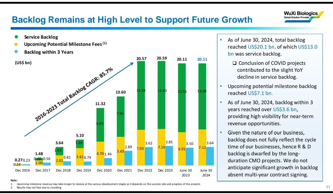 此外,财报还显示,药明生物未完成订单201.1亿美元。截至2024年6月30日,3年内的未完成订单金额超过36亿美元,为近期收入机会提供了很大机会。