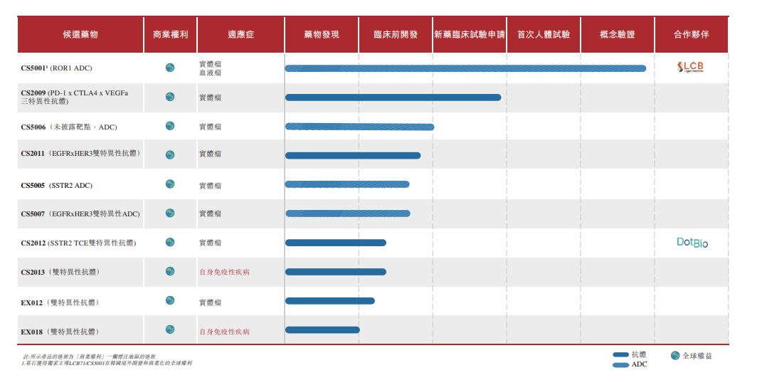 比如,我们的CS5001是截至目前首个在实体瘤和淋巴瘤中均展示出临床抗肿瘤活性的ROR1抗体偶联药物;靶向PD-1、CTLA-4、VEGFa的三特异性抗体CS2009是潜在的同类首创/同类最优的下一代肿瘤免疫骨架产品,预计在2024年或2025年提交新药临床试验申请。