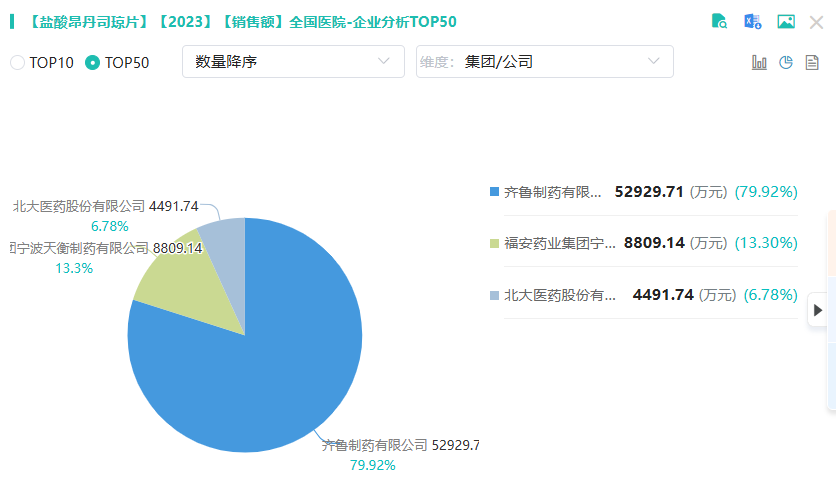 据药融云数据库显示,盐酸昂丹司琼片在2023年全国院内市场的销售额突破6亿元大关。在企业竞争格局方面,齐鲁制药凭借其卓越的市场表现,占据医院市场的主导地位,市场份额高达79.92%,几乎独占鳌头。紧随其后的是福安药业,其市场份额也达到了可观的13.30%。
