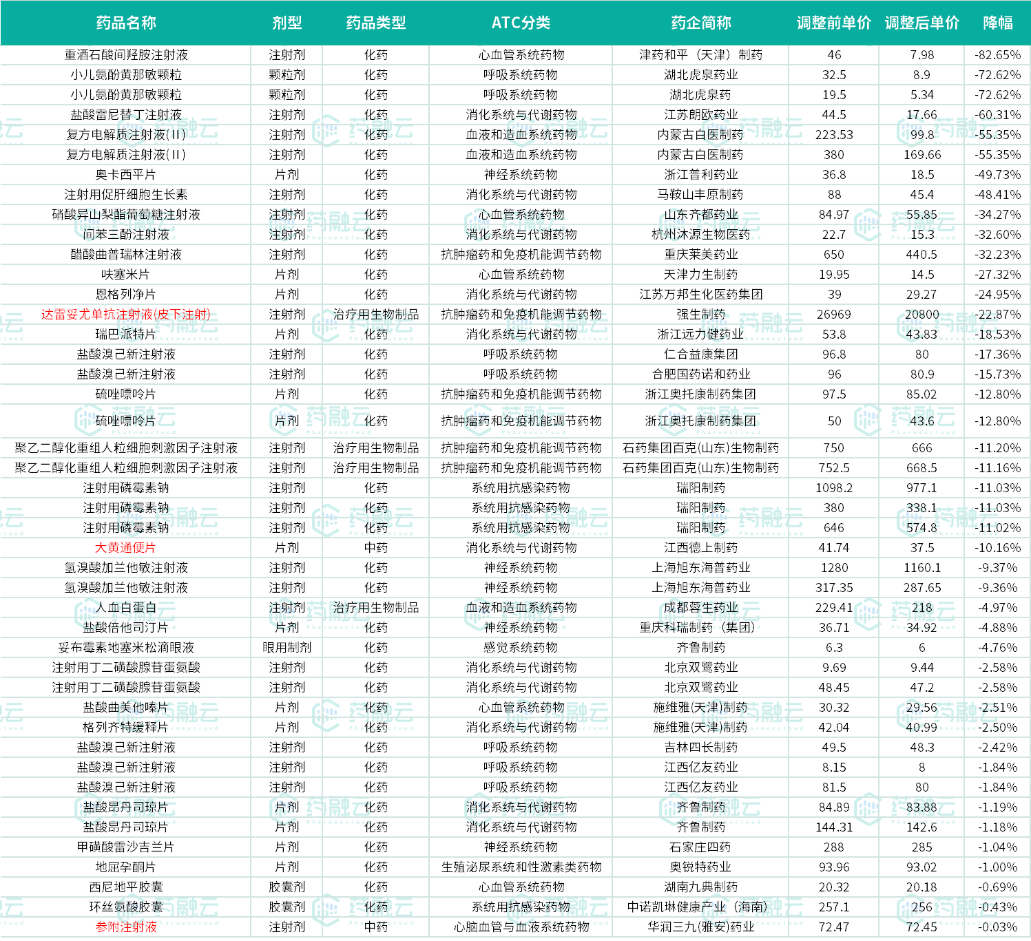 44个药品(按产品品规统计)主动降价,涵盖了化学药、生物药、中药三大类。从降价幅度来看,津药和平的重酒石酸间羟胺注射液由46元下降至7.98元,降幅82.65%,是本次降幅最高的品种。此外,华润三九的独家中药品种参附注射液由72.47元下降至72.45元,降幅0.03%,是本次降幅最小的品种。