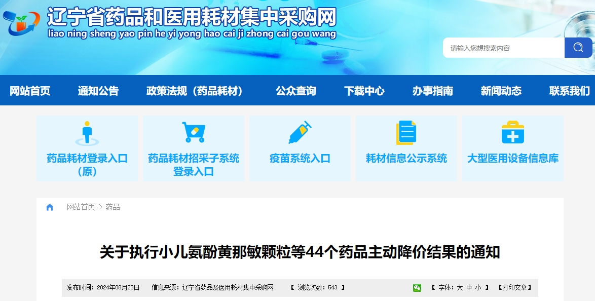 8月23日,辽宁省药品集中采购网发布一则药品降价通知。本次共计44个药品(按品规统计)主动降价,降价产品设置采购过渡期,时间为1周,于8月28日起执行新的挂网采购价格。