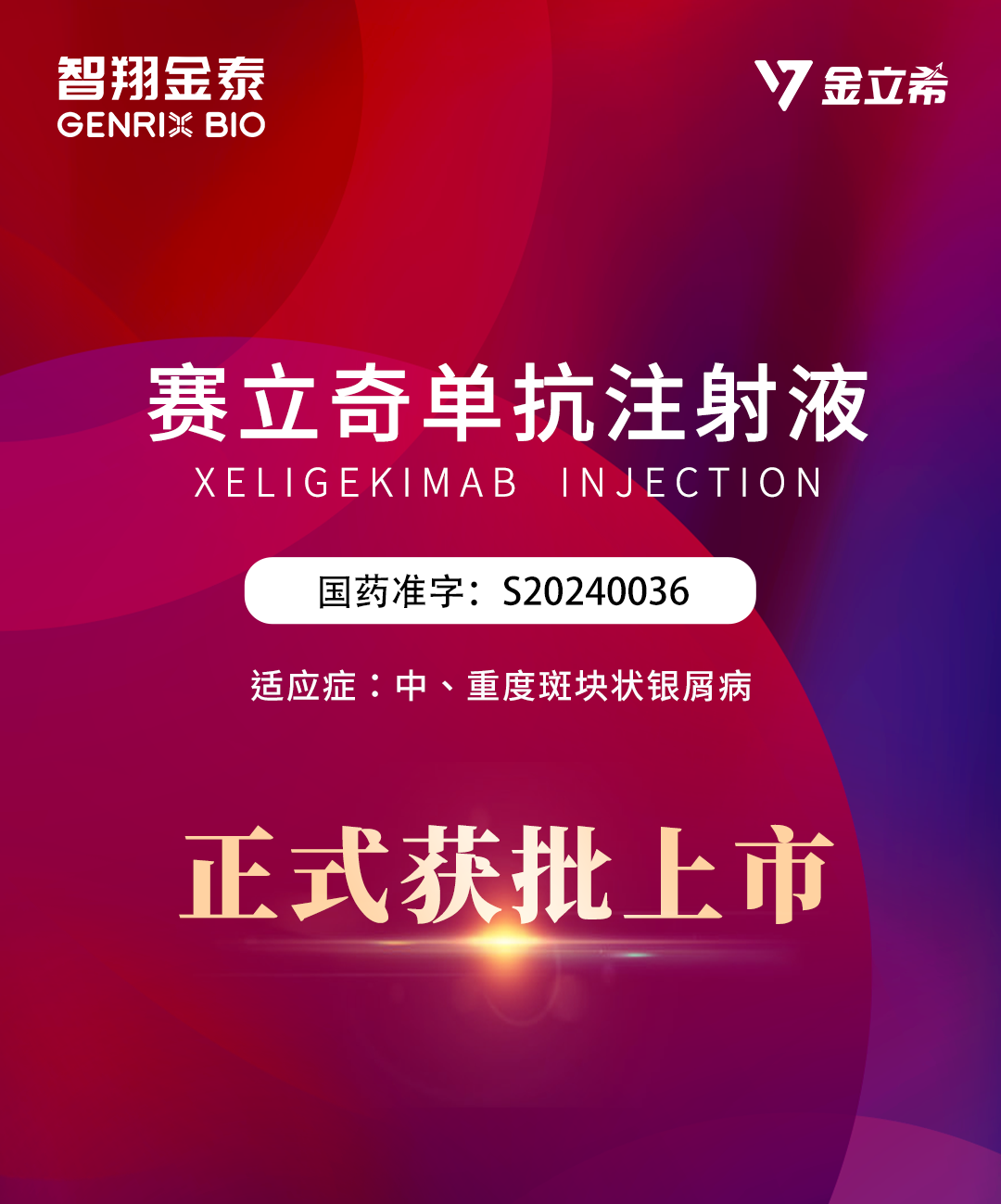 8月27日,智翔金泰发布公告,其自主研发的1类新药赛立奇单抗注射液(商品名:金立希®)获得国家药监局核准签发的《药品注册证书》,正式获批上市,用于中、重度斑块状银屑病的治疗。