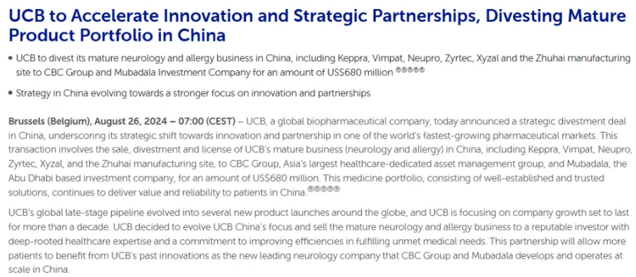 本次收购涉及优时比在中国大陆的神经系统成熟产品(开浦兰®、维派特®、优普洛®)与抗过敏产品(仙特明®、优泽®),以及位于珠海的生产基地。2023年,该交易所涵盖的产品在中国的总销售额达1.31亿欧元。该交易尚需达成若干交割条件,包括必要的反垄断审查及其他惯例条件,预计将于2024年第四季度完成。