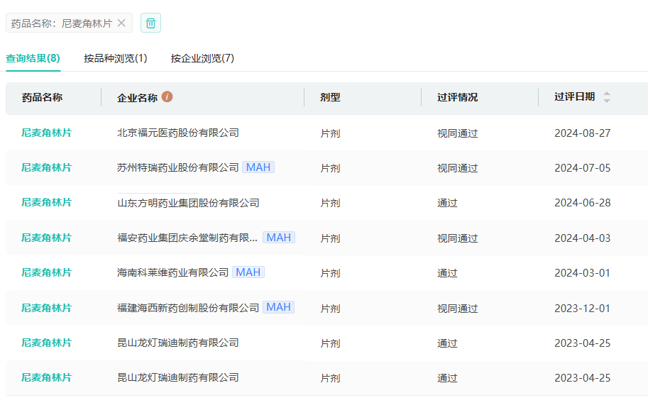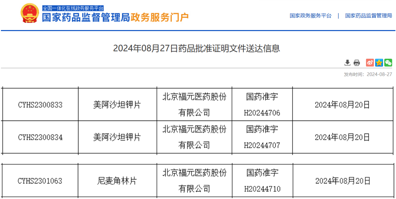 8月27日,据NMPA公示,北京福元医药提交的美阿沙坦钾片获批生产并视同过评。同日北京福元医药还拿下了畅销的尼麦角林片这款心血管系统药物,据药融云数据库显示,尼麦角林片在2023年全国院内市场的销售额超2亿元。