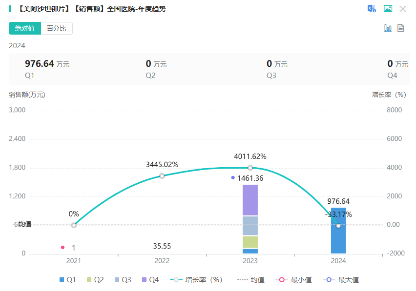 美阿沙坦钾是武田开发的血管紧张素受体拮抗剂(ARB),与其他沙坦类药物作用机制相同,通过阻止血管紧张素与血管上的受体结合,抑制“肾素-血管紧张素-醛固酮”系统(RAAS),从而发挥降压作用。2021年1月,武田药品的美阿沙坦钾片获批中国进口。2022年进入医保。近2年美阿沙坦钾片院内市场迅速放量,2022年销售额超35万元,2023年销售额超1400万,同比增长达4011.62%。