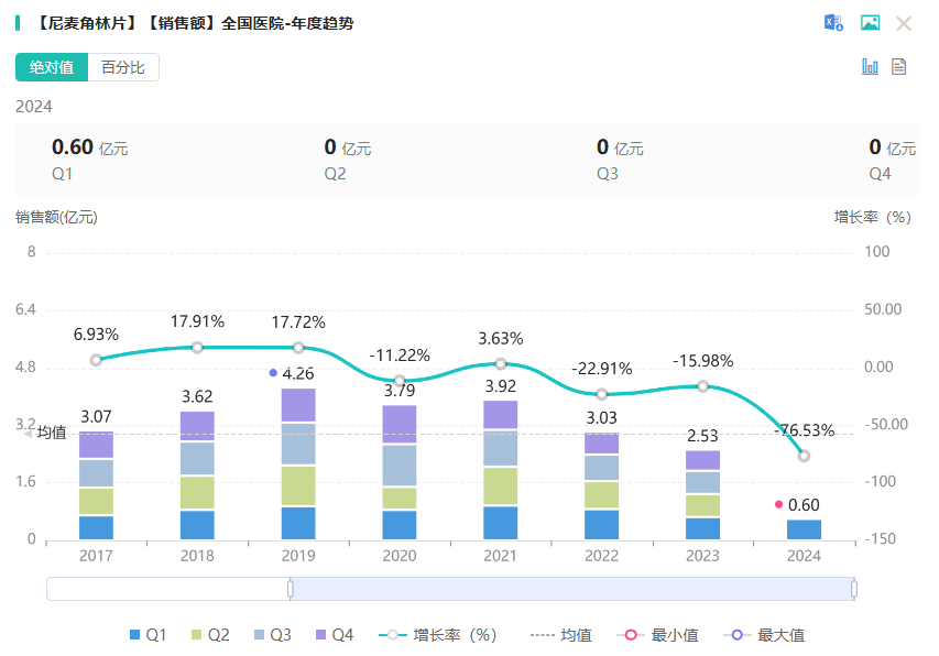尼麦角林片是一款畅销的脑血管治疗用药,主要用于改善脑梗塞后遗症引起的意欲低下和情感障碍,急性和慢性周围循环障碍,也适用于血管性痴呆,尤其在早期治疗时对认知、记忆等有改善,并能减轻疾病严重程度。据药融云数据库显示,在2023年全国院内市场,心血管系统药物(化学药或生物药)总销售额达到743.5亿元,其中尼麦角林片的销售额超过2亿元。