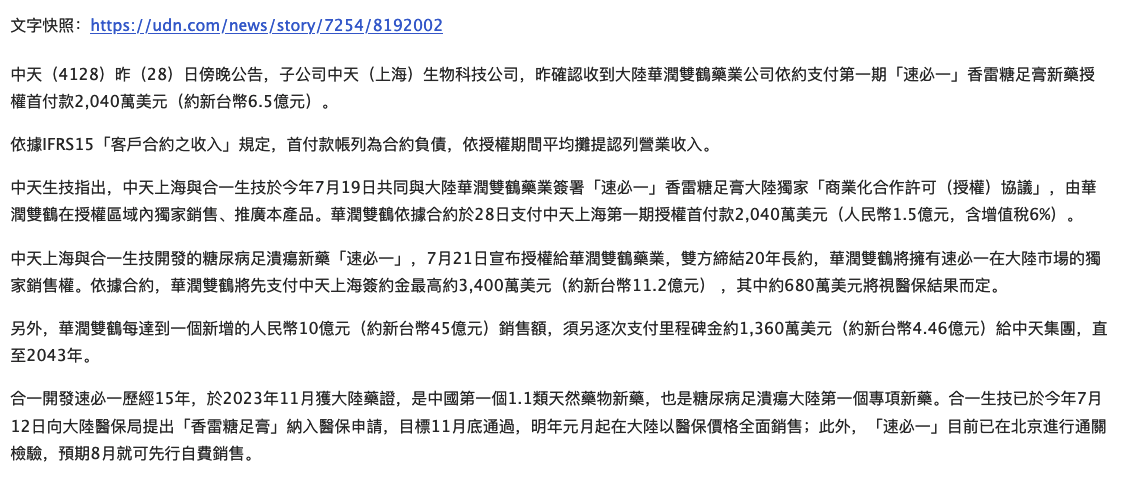 我国台湾省的上市公司中天(4128)8月28日傍晚公告,子公司中天(上海)生物科技公司,昨确认收到大陆华润双鹤药业公司依约支付第一期「速必一」香雷糖足膏新药授权首付款2,040万美元(约新台币6.5亿元)。依据IFRS15「客户合约之收入」规定,首付款帐列為合约负债,依授权期间平均摊提认列营业收入。