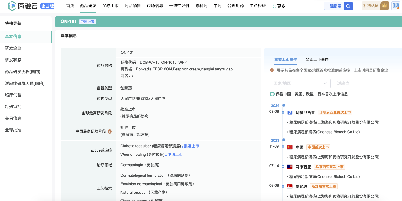 国际糖尿病联盟2021年数据显示,我国成人糖尿病患者数达1.41亿人,我国50岁以上的糖尿病患者,糖尿病足溃疡的发病率高达8.1%,总截肢率19.03%,是一个重大未满足的医疗迫切需求。香雷糖足膏(速必一)于2023年11月通过中国第一个1.1类天然药物新药许可。此前,中天(上海)生物科技有限公司和上海海和药物研究开发股份有限公司合作开发。