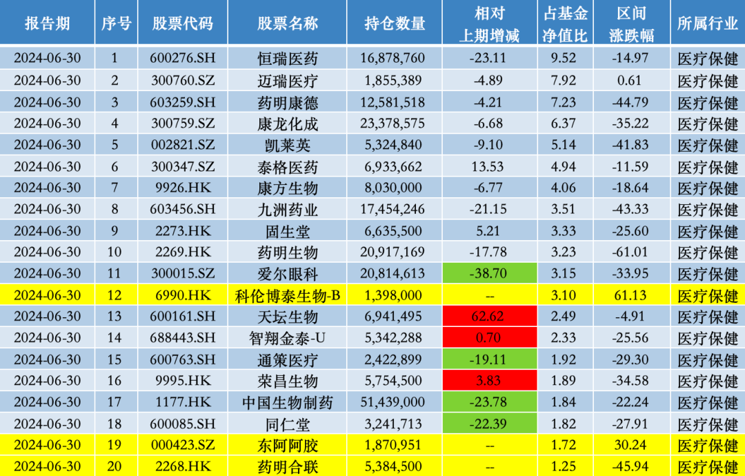 总之,从2024年中报披露的隐形重仓股持仓(第11名至第20名重仓股)来看,继2023年上半年后,上海医药重回中欧医疗健康持仓名单中;同样是医药主题基金的中欧医疗创新,则于今年上半年首次建仓科伦博泰生物、东阿阿胶、药明合联。
