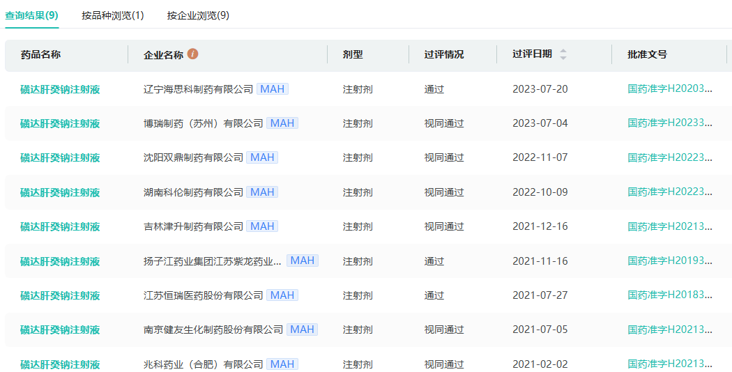 截至目前,磺达肝癸钠注射液在国内市场有10家药企拥有生产批文,其中江苏恒瑞医药、扬子江药业集团江苏紫龙药业、湖南科伦制药、辽宁海思科制药等9家药企过评。