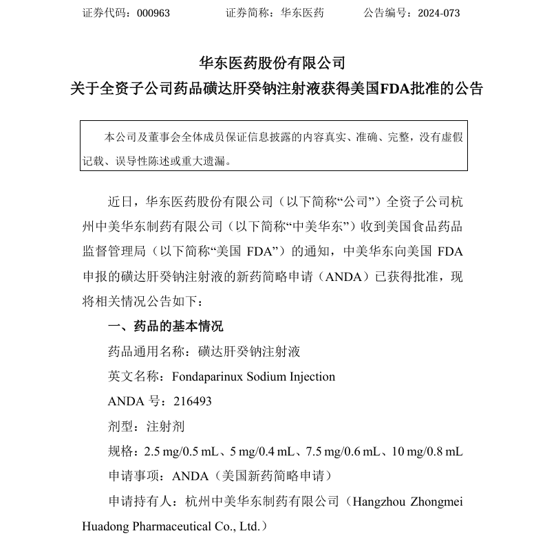 8月28日,华东医药发布公告,其全资子公司杭州中美华东制药向美国 FDA申报的磺达肝癸钠注射液的新药简略申请(ANDA)已获得批准。据药融云数据库显示,磺达肝癸钠注射液在2023年全国院内市场的销售额超1亿元。