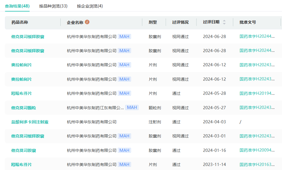 目前,华东医药(含子公司)有33个品种过评,其中二甲双胍恩格列净片(Ⅰ)、西格列汀二甲双胍片(Ⅰ)、他克莫司胶囊等9个品种为首家过评。