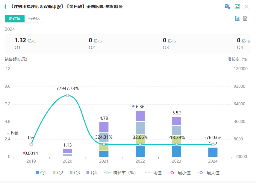 8月30日,人福医药发布公告,其控股子公司宜昌人福药业提交的注射用福沙匹坦双葡甲胺获批上市。据药融云数据库显示,该品种在2023年全国院内市场的销售额超5亿元。