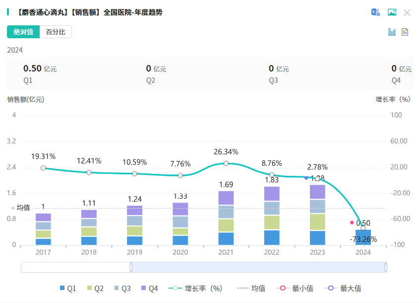 麝香通心滴丸为国内中药独家品种,于2008年获批上市,2017年获批为国家中药二级保护品种,保护期为 7 年。本次为该药品获批国家中药二级保护品种到期后的延保,保护期延长至2031年1月14日。是国家医保目录乙类品种。据药融云数据库显示,麝香通心滴丸在2023年全国院内市场的销售额达1.88亿元,同比增长达2.78%。