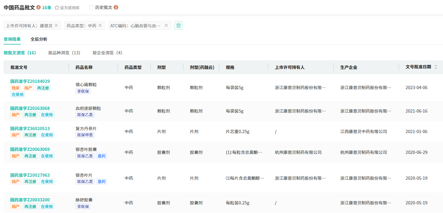 康恩贝目前心脑血管与血液系统药物领域,重点布局麝香通心滴丸品种,除该品种,目前该领域,康恩贝(含子公司)还拥有镇心痛颗粒、复方丹参片、丹参舒心胶囊、可达灵片等多款心脑血管与血液系统药物中成药的生产批文。