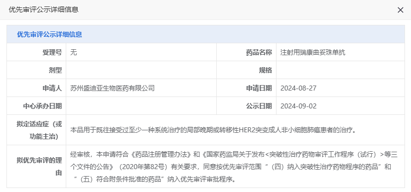 9月2日,据CDE官网显示,恒瑞医药子公司苏州盛迪亚生物医药的注射用瑞康曲妥珠单抗(SHR-A1811)拟纳入优先审评,用于既往接受过至少一种系统治疗的局部晚期或转移性 HER2 突变成人非小细胞肺癌患者的治疗。
