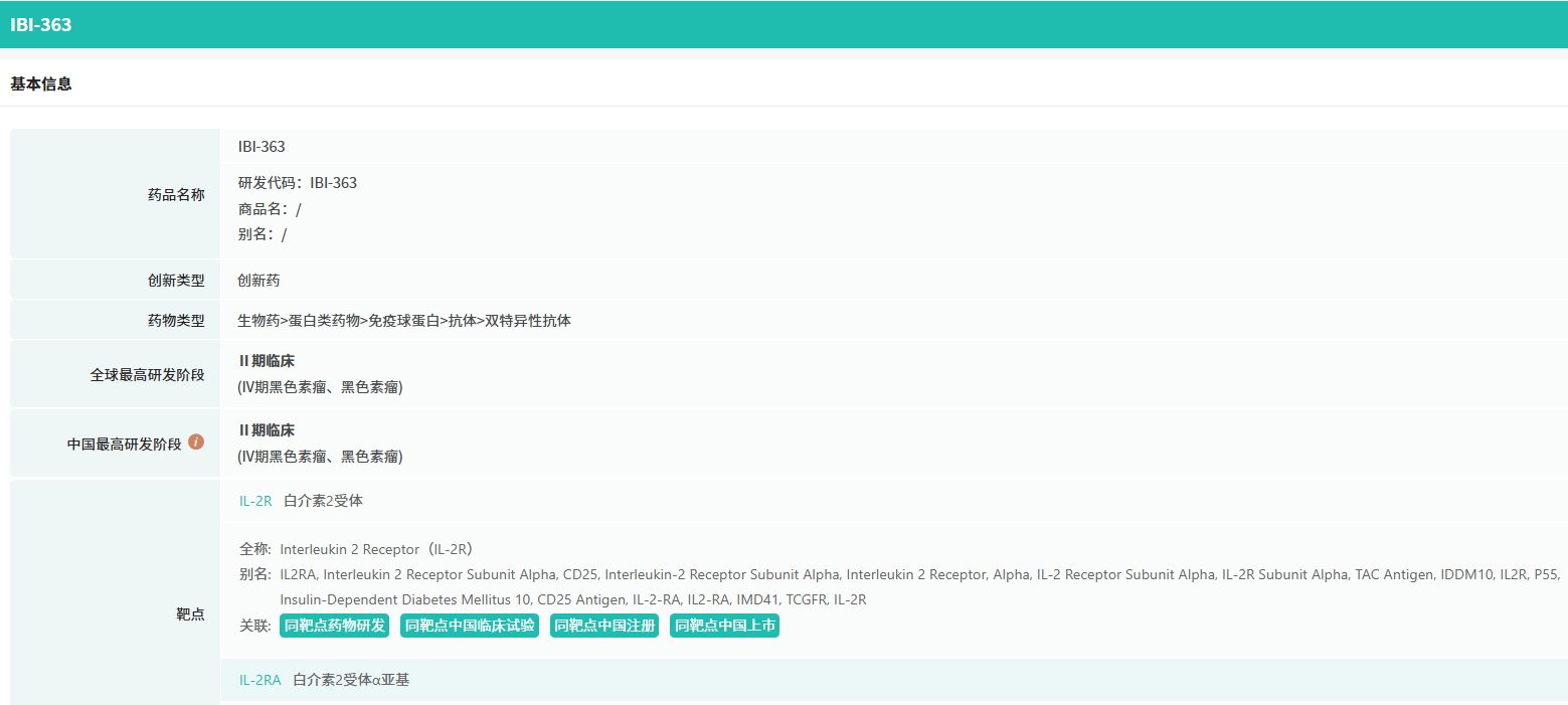 9月4日,信达生物宣布其PD-1/IL-2α-bias双特异性抗体融合蛋白IBI363获得美国FDA授予快速通道资格(fast track designation, FTD),拟定适应症为既往接受过至少一线含PD-1/L1检查点抑制剂系统性治疗后进展的局部晚期或转移性黑色素瘤(脉络膜黑色素瘤除外)。