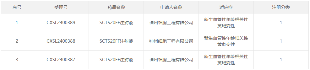 9月2日,据CDE官网显示,神州细胞1类新药SCT520FF注射液获批临床,适应症为新生血管性年龄相关性黄斑变性。该药物是神州细胞开发的一款1类创新药,拟用于治疗新生血管性年龄相关性黄斑变性。