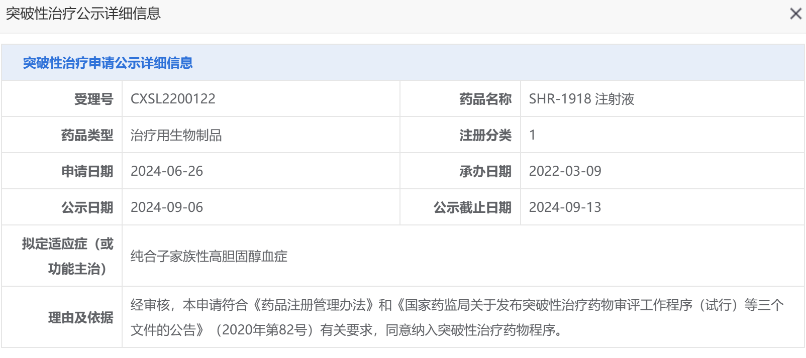 9月6日,CDE官网显示,恒瑞医药的SHR-1918 注射液拟纳入突破性治疗品种,适应症为:纯合子家族性高胆固醇血症。