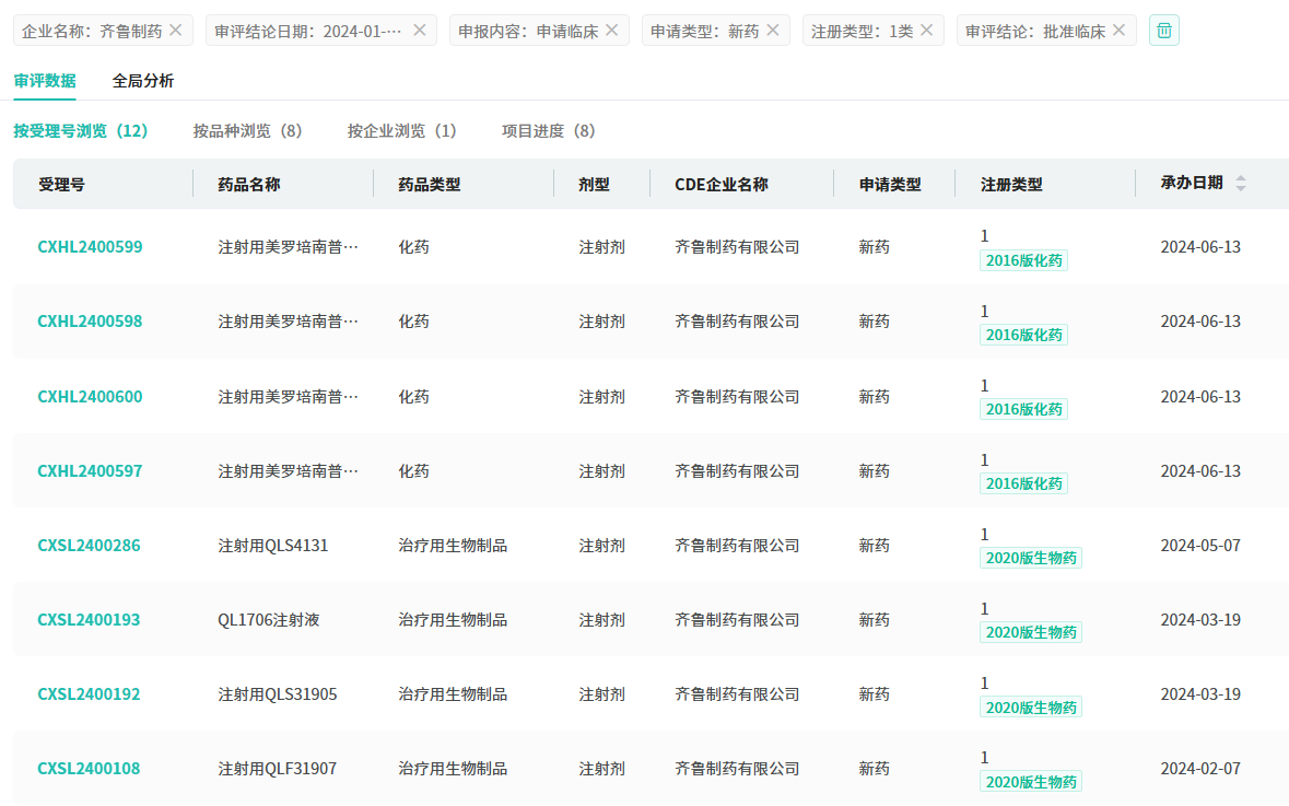 9月3日,据CDE官网公示,齐鲁制药申报的1类新药注射用美罗培南普莱巴坦获得临床试验默示许可,拟用于治疗复杂性腹腔感染。据药融云数据库显示,2024年至今,齐鲁制药有8款1类新药获批临床。
