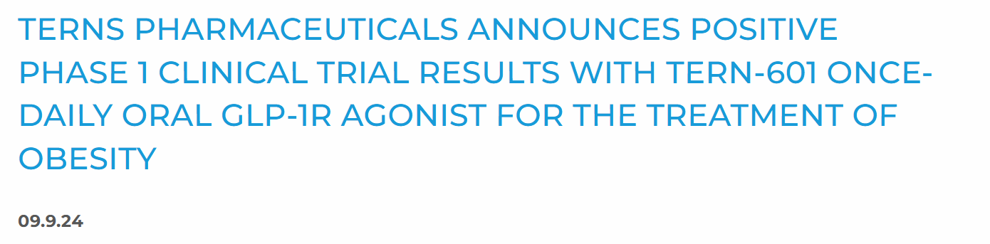 9月9日,临床阶段的生物制药公司Terns Pharmaceuticals, Inc. (Nasdaq: TERN)公布,其口服GLP-1R激动剂TERN-601的Ⅰ期试验结果,结果显示,TERN-601的最高剂量组达到了4.9%的安慰剂调整平均体重减轻,患者每天接受一次TERN-601。公司还表示,这组67%的参与者减掉了5%或更多的基线体重。