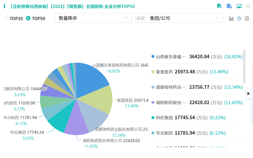 据药融云数据库统计,注射用哌拉西林钠过评药企达15家。注射用哌拉西林钠在2023年全国院内市场的销售额超19亿元,其中山西振东泰盛制药市场份额占比最高,达18.92%,其次是复星医药,市场份额占比达13.49%,成都倍特药业的市场份额占比达12.34%。