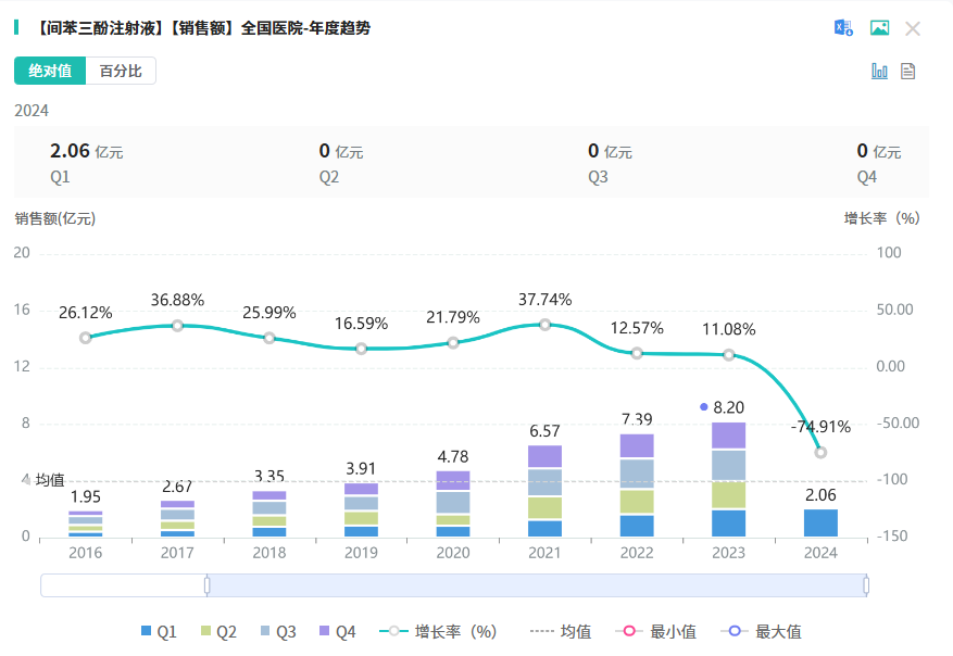 其中,间苯三酚注射液是临床使用最普遍适应症最广泛的解痉药物,国内市场,间苯三酚注射液有30家药企获批,过评的有29家药企,市场竞争态势尤为激烈。据药融云数据库显示,该品种在2023年全国院内市场的销售额超8亿元,同比增长达11.08%。