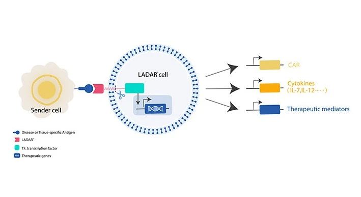 LADAR®技术的目标基因的细胞内转录由一个人工受体控制,该受体在细胞内结构域中含有转录因子。一旦LADAR受体的胞外结构域与触发抗原(发送者抗原)结合,转录因子就会被切割并转移到细胞核,从而触发目标基因的表达。感兴趣的基因可能是嵌合抗原受体(CAR)、细胞因子或任何需要的治疗介质。
