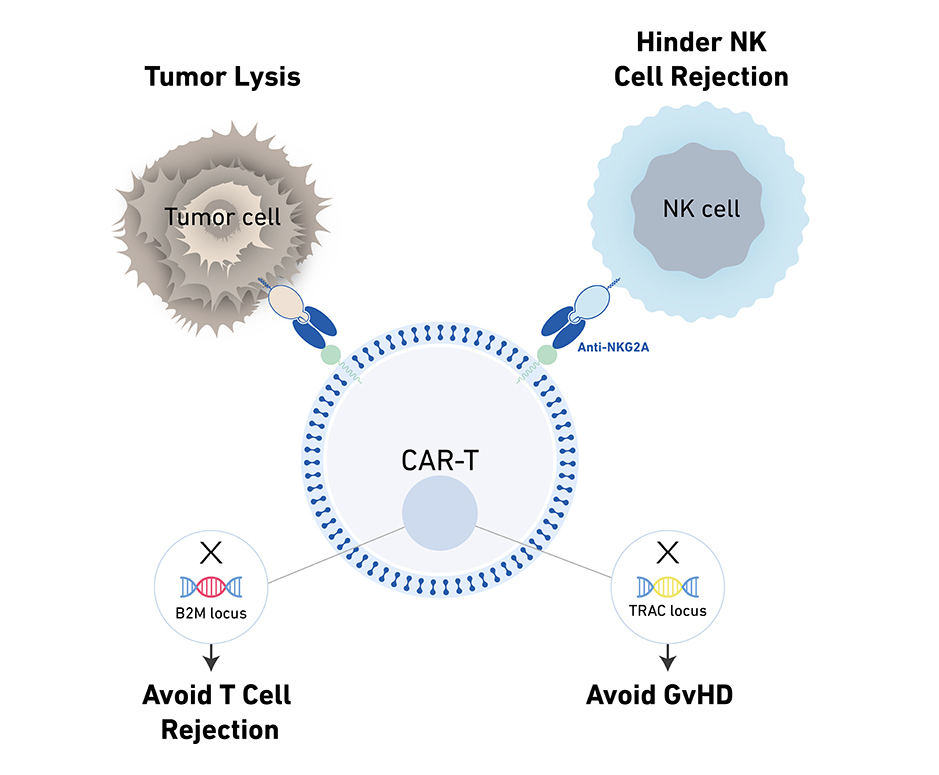 为了尽可能减少同种异体T细胞的移植物抗宿主病(GvHD)和宿主抗移植物反应(HvGR),其破坏了编码TCR和β2微球蛋白(B2M)的基因组位点,以 消除TCR或人类白细胞I类抗原(HLA-I)的表面表达,这种方法已经被先前的研究所验证。然而,由于自然杀伤(NK)细胞会攻击没有HLA-I表达的T细胞,进而限制了同种异体CAR-T细胞的扩增和持久性。
