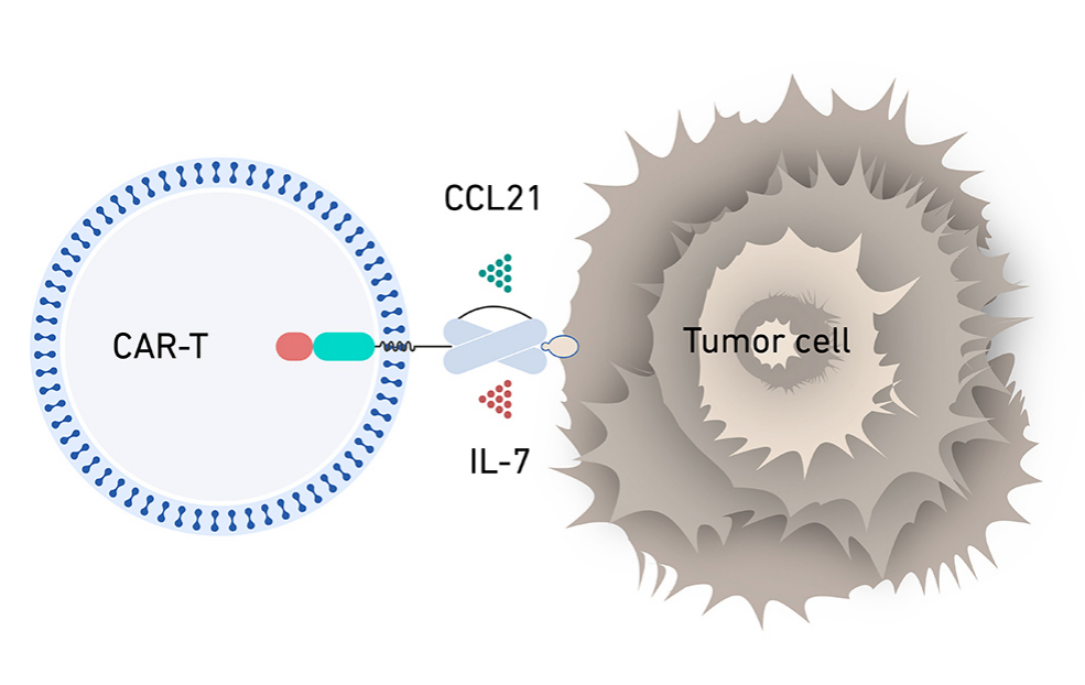 CycloCAR-T(Cytokine and Chemokine Loaded CAR,细胞因子和趋化因子负载的嵌合抗原受体),通过设计表达细胞因子IL-7(白介素-7)和趋化因子CCL21,有望显著增强针对实体瘤CAR-T细胞的疗效。T细胞的募集、存活和增殖是CAR-T细胞疗法在实体瘤治疗中的重要限制。IL-7 作为一种细胞因子,可以增强CAR-T细胞的增殖和存活,而 CCL21作为一种趋化因子,可以驱动淋巴细胞和树突状细胞募集到肿瘤部位。CycloCAR-T细胞还可以抑制具有异质抗原表达的肿瘤组织的生长,甚至可以诱导肿瘤的完全缓解。从机制上讲,IL-7和CCL21显著改善了肿瘤中CAR-T细胞和树突状细胞的存活和浸润。此外,免疫组化证实CCL21还可以抑制肿瘤的血管生成。