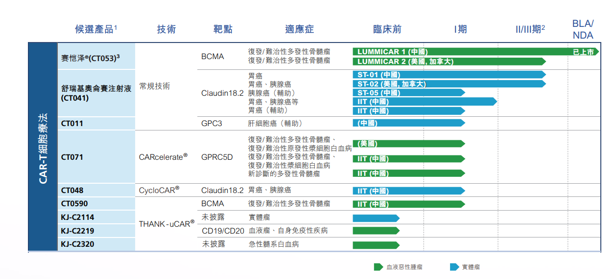 公司已建立一个涵盖整个CAR-T开发周期的综合研发平台,包括靶点发现、抗体开发、载体设计、制造、质量保证以及质量控制。公司的综合细胞疗法平台由靶点发现、杂交瘤和抗体人源化平台、全人源噬菌体展示抗体库平台、抗体识别平台、免疫细胞功能评估平台、质粒和慢病毒载体制备平台、细胞治疗流程开发平台、以及具备分子、流式细胞仪、生化、物理化学及细胞分析能力的分析平台、生物样本检测平台、临床规模及商业规模的CAR-T制造平台及临床研究平台组成。