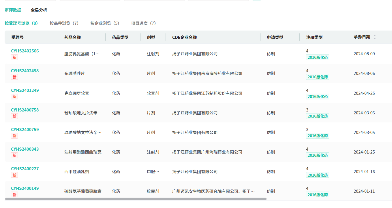 2024年至今,扬子江药业(含子公司)提交了西甲硅油乳剂、琥珀酸地文拉法辛缓释片、克立硼罗软膏等7个品种的仿制申请。