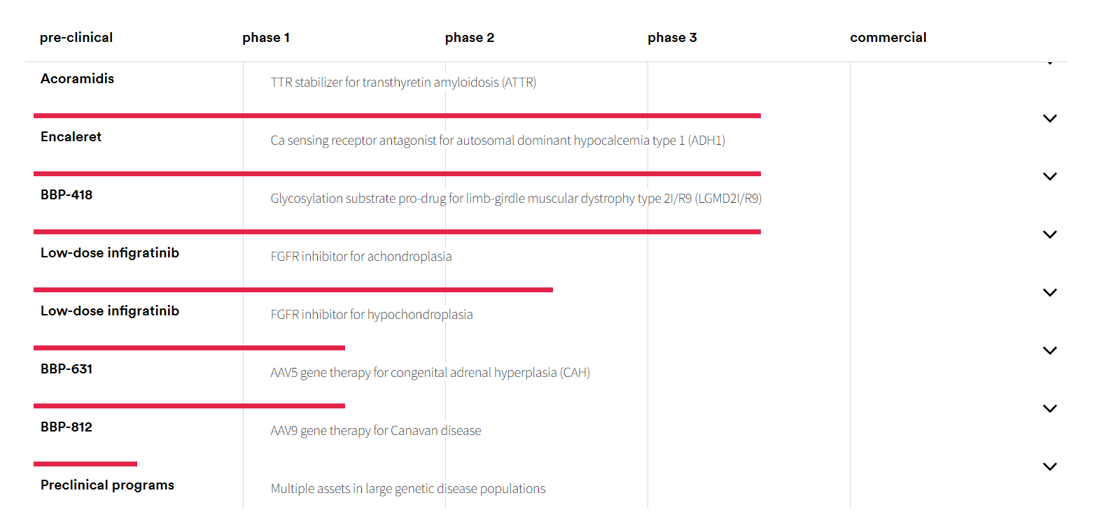 公司管线中还有一款用于治疗卡纳万病的在研静脉注射(IV)AAV9基因疗法BBP-812。2024年9月10日,BridgeBio Pharma宣布美国FDA已授予BBP-812再生医学高级疗法(RMAT)称号,RMAT指定是在美国FDA对研究BBP-812的CANaspire 1/2期临床试验的临床数据进行审查后授予的,BBP-812是一种潜在的疗法,可满足卡纳万病患者尚未得到满足的医疗需求。