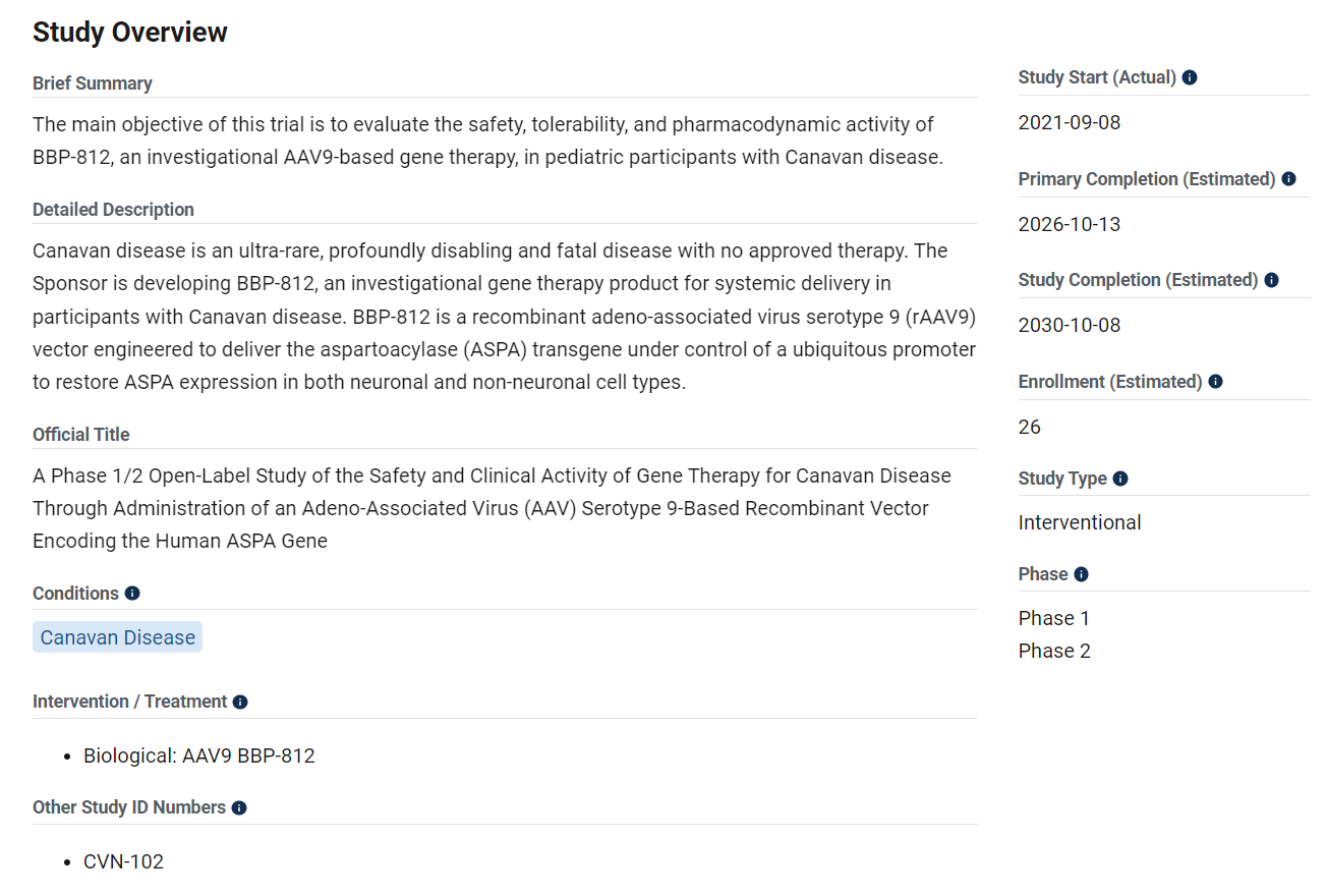 据联邦试验数据库显示,BridgeBio的子公司Aspa Therapeutics正在一项1/2期开放标签研究中测试这种代号为BBP-812的疗法,该研究将于2026年10月结束。