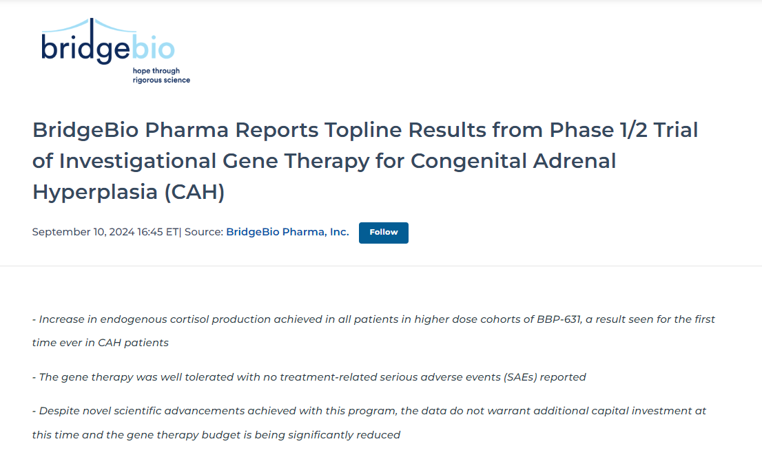 2024年9月10日,专注于遗传性疾病的BridgeBio Pharma宣布了公司在研的AAV5基因疗法BBP-631用于治疗先天性肾上腺皮质增生症(CAH)的1/2期开放标签ADventure研究的初步结果。鉴于试验结果未达到目前需要追加资本投资的门槛,公司表示将不会继续推进该试验,此外将继续监测于2021年开始的这项研究中的八名入组患者,目前没有与治疗相关的严重不良事件报告。