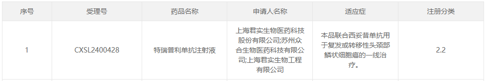 9月10日,据CDE官网显示,君实生物医药的抗PD-1单抗特瑞普利单抗注射液获得一项新的临床试验默示许可,拟联合西妥昔单抗用于复发或转移性头颈部鳞状细胞癌的一线治疗。