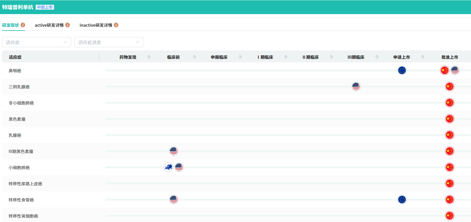 正在进行或已完成的关键注册临床研究在多个瘤种范围内评估特瑞普利单抗的安全性及疗效。据药融云数据显示,截至目前,特瑞普利单抗已在中国内地获批10项适应症,涵盖黑色素瘤、鼻咽癌、尿路上皮癌、食管鳞癌、非小细胞肺癌、肾细胞癌、小细胞肺癌、三阴性乳腺癌。今年7月和8月,该产品一线治疗肝癌和一线治疗黑色素瘤的新适应症上市申请也分别获CDE受理。
