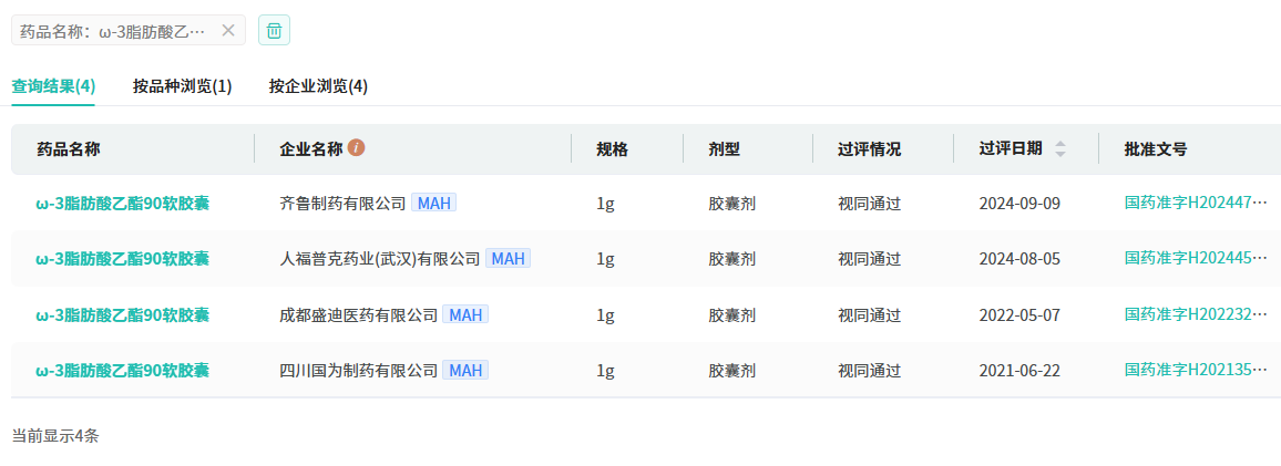 据药融云数据库显示,原研厂家的ω-3脂肪酸乙酯90软胶囊于2022年4月获批进入国内市场。目前该品种在国内市场有齐鲁制药、四川国为制药、成都盛迪医药、人福普克药业(武汉)4家药企过评,其中四川国为制药是首家过评该品种的药企,此次,齐鲁制药是第4家。