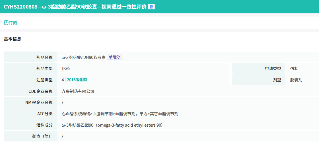 近日,据药融云数据库显示,齐鲁制药申报的4类仿制药ω-3脂肪酸乙酯90软胶囊获批生产并视同过评,为国产第4家过评该品种的药企。这是一款口服降脂药,在2023年全国院内市场的销售额超300万元。