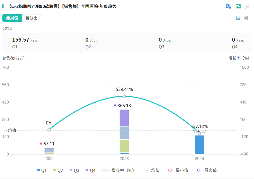 ω-3脂肪酸乙酯90软胶囊主要活性成分是鱼油中提取的二十碳五烯酸(EPA)和二十二碳六烯酸(DHA),可减少甘油三酯在肝脏中的合成,适用于在控制饮食的基础上,降低重度高甘油三酯血症(≥500mg/dL)成年患者的甘油三酯(TG)水平。已在全球多个国家和地区上市多年,积累了超过十年以上的临床应用经验。据药融云数据库显示,ω-3脂肪酸乙酯90软胶囊在2023年全国院内市场的销售额超300万元,同比增长达539.41%。
